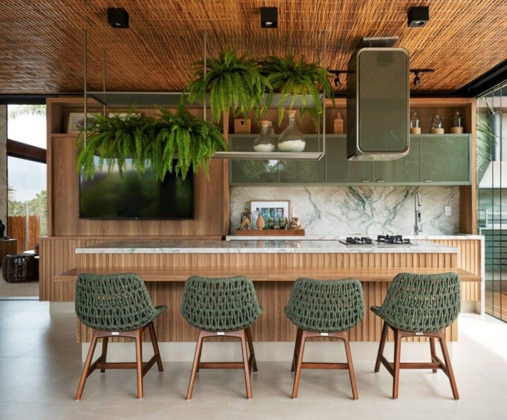 Com um teto de madeira, uma bancada de mármore e plantas em vasos, o ambiente se torna leve e convidativo.
