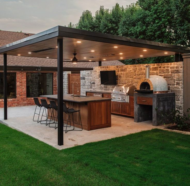 Com um pergolado coberto, esse espaço pode contar com uma ilha central para preparo dos alimentos, uma churrasqueira e um forno de pizza. A combinação de materiais como madeira e pedra natural cria um visual sofisticado e robusto.