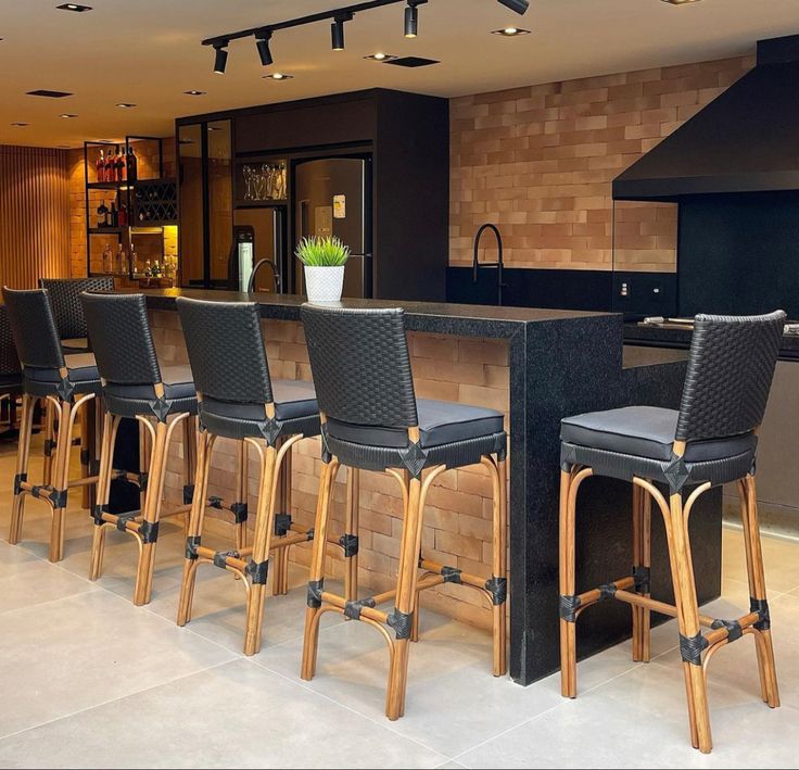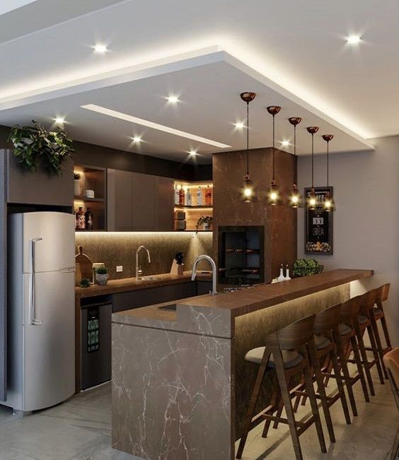 Combine elementos como concreto, metal e madeira para criar um visual moderno e despojado no seu espaço gourmet. A ilha central com acabamento em mármore escuro, os armários com iluminação interna e as prateleiras abertas são características marcantes desse estilo.