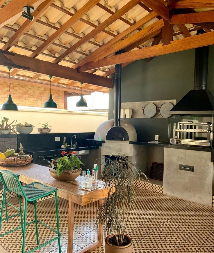 Você pode fazer isso combinando elementos rústicos, como tijolos aparentes, madeira e um forno de pizza, com móveis de linhas retas e uma iluminação moderna que dão uma atualizada no espaço.