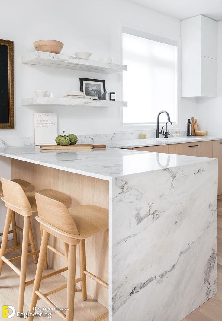 O mármore branco também se integra harmoniosamente com armários em tons claros e detalhes em madeira, criando um ambiente sofisticado e acolhedor.