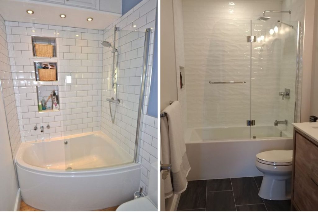 Escolha uma banheira que tenha um design retangular e instale-a no próprio box do chuveiro, com vidro ao redor para evitar respingos.