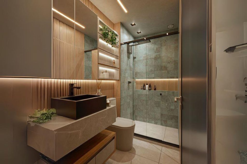 As cores podem influenciar significativamente a percepção de espaço. Tons escuros ou saturados podem fazer o banheiro parecer menor e mais fechado.