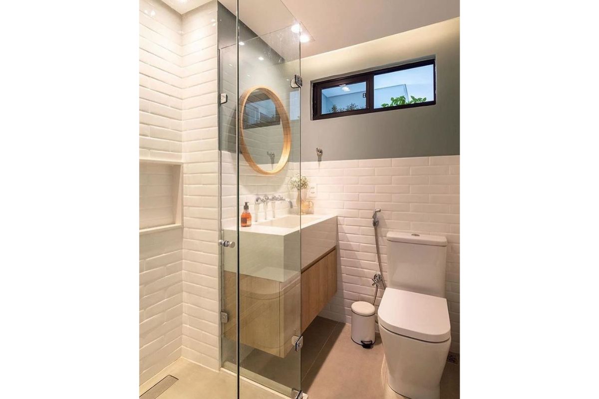 O tipo e o tamanho do revestimento podem influenciar na percepção de espaço de um banheiro pequeno.