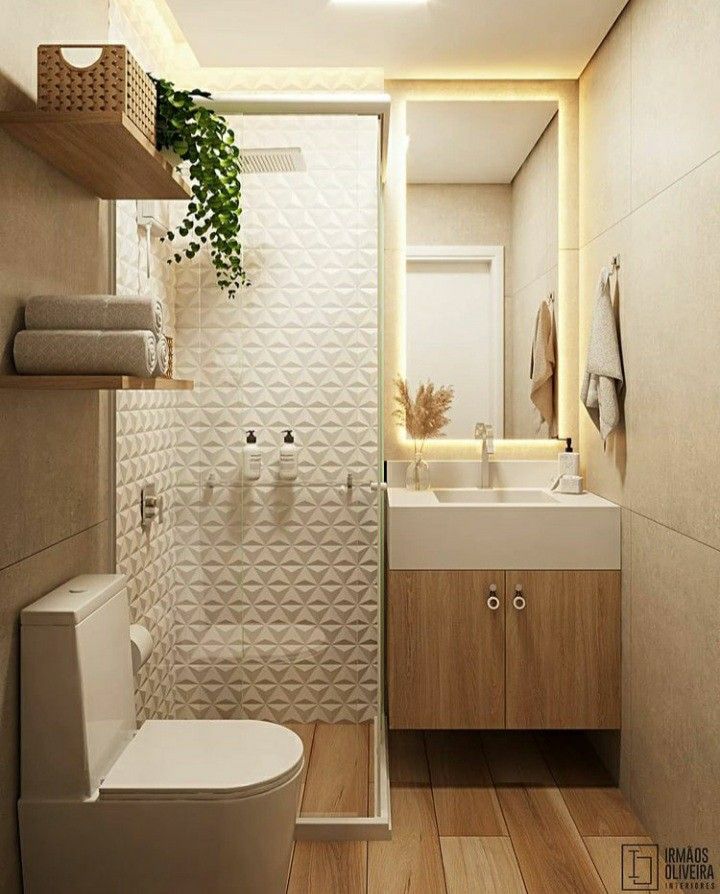 O minimalismo funciona muito bem em banheiros compactos. Aposte em revestimentos lisos, móveis de linhas retas e uma paleta de tons claros como branco, bege ou cinza.