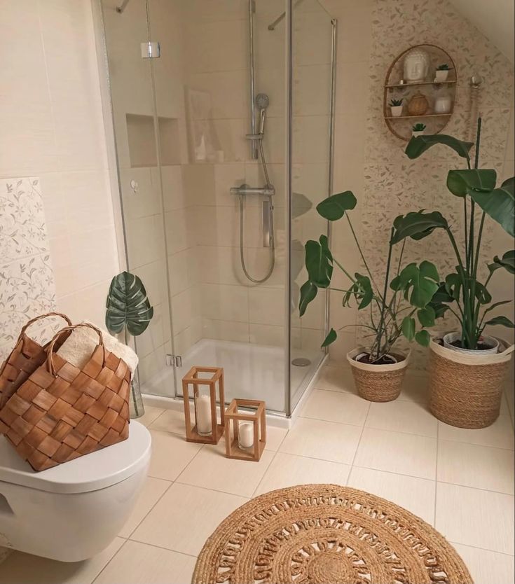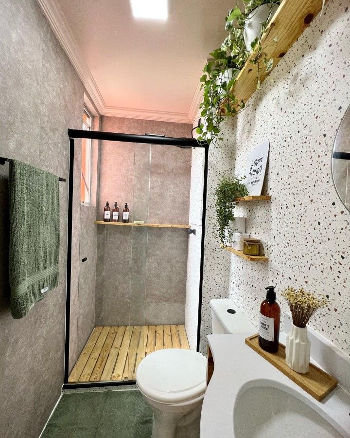 Elementos naturais, como pedras e plantas, criam banheiros relaxantes e convidativos. Aposte em tons verdes e marrons para trazer ainda mais aconchego.