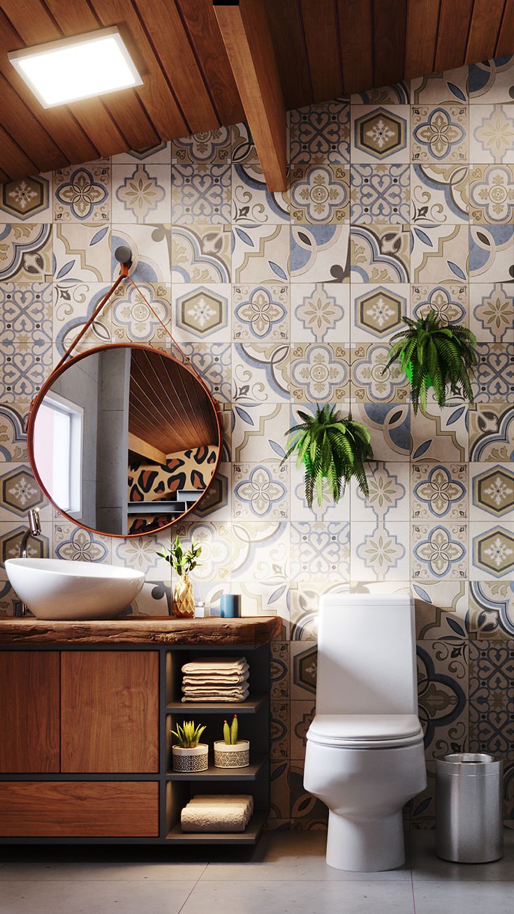 Azulejos tipo ladrilho hidráulico e móveis com acabamento retrô podem transformar um banheiro pequeno em um ambiente charmoso e nostálgico.