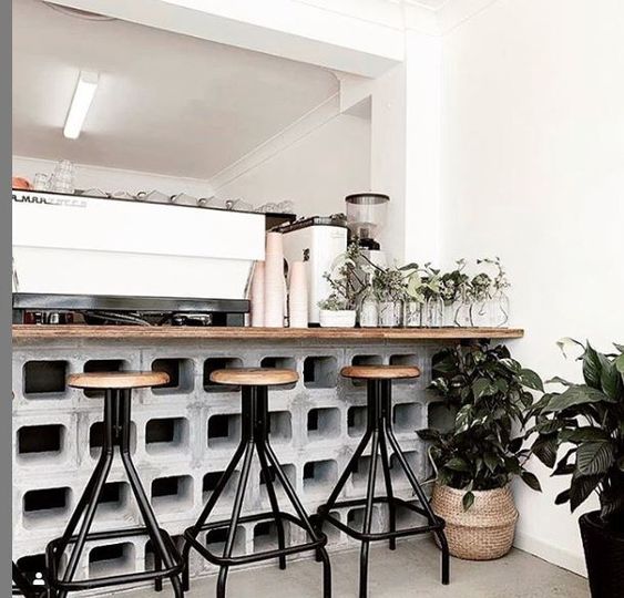 Use blocos de concreto como base para criar um balcão de cozinha. Adicione uma bancada de pedra ou madeira por cima.