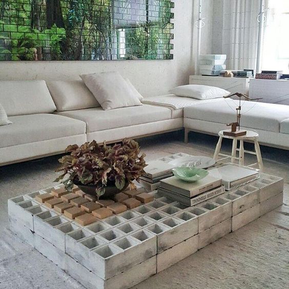 Empilhe blocos para formar uma base sólida e coloque uma tampa de vidro ou madeira por cima para criar uma mesa de centro.