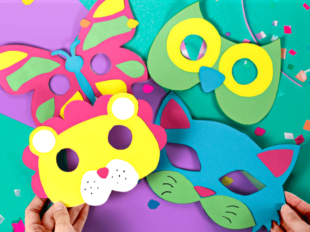 As máscaras divertidas são perfeitas para transformar a decoração do espaço ou da mesa de comes e bebes. Dá para fazê-las com papel, usando os materiais que listamos a seguir: