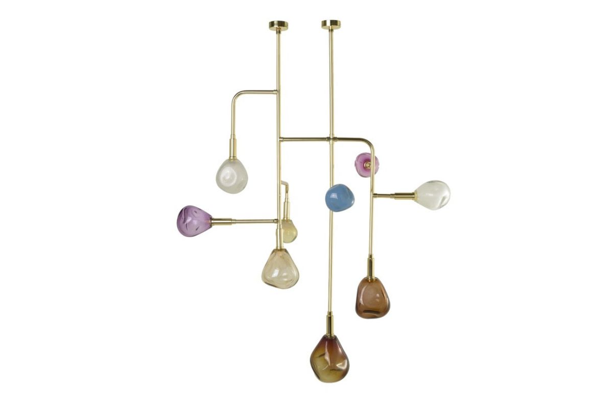 O lustre se destaca com suas nove esferas de vidro, cada uma moldada e insuflada individualmente por Schuartz. As esferas são coloridas e brilham quando iluminadas, montadas de forma assimétrica sobre uma estrutura de latão.