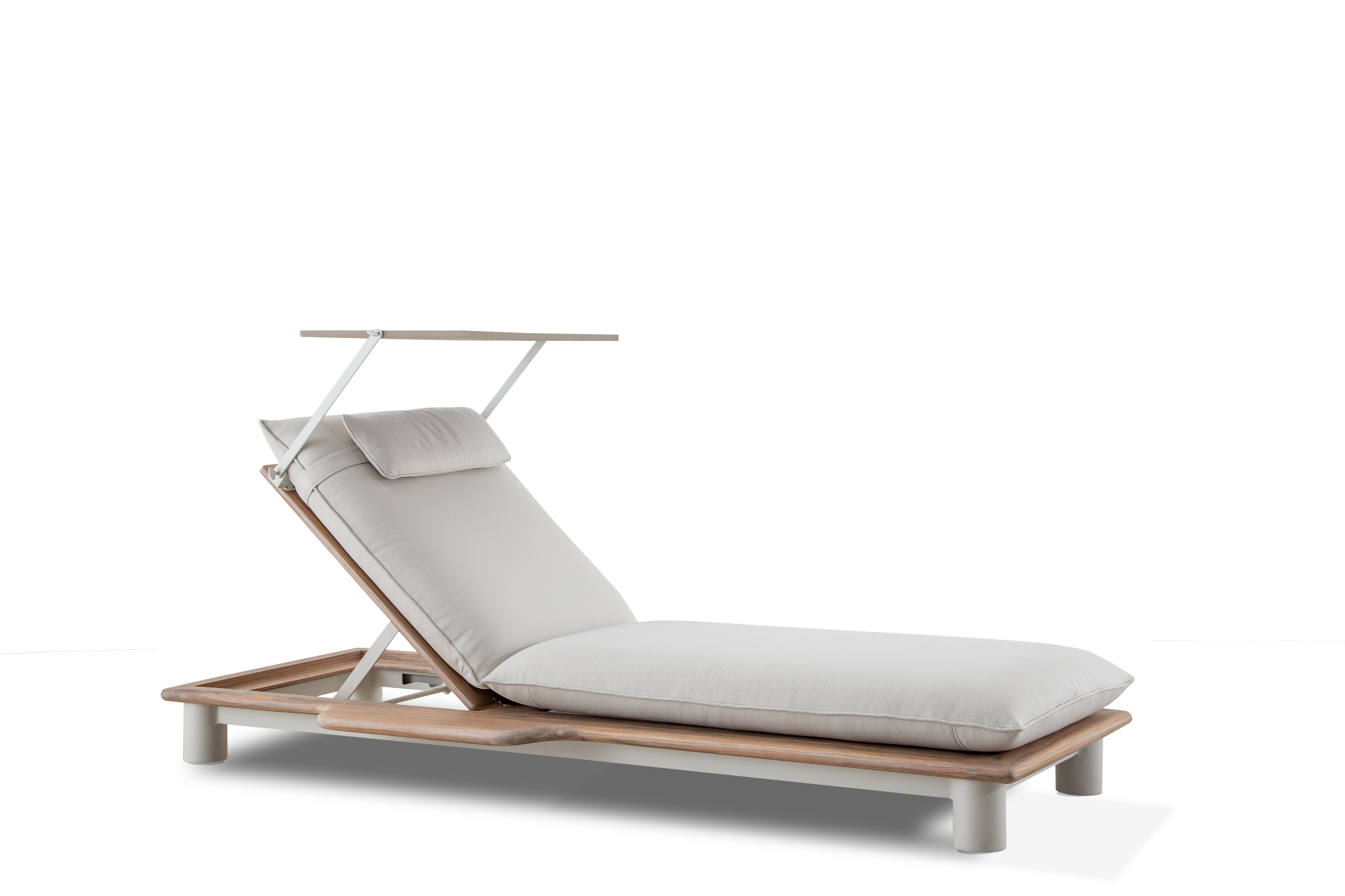 A espreguiçadeira Viseira, pensada para aliar funcionalidade e estética agradável, vem equipada com um sombreiro para proteção solar, um diferencial criativo da Green House.