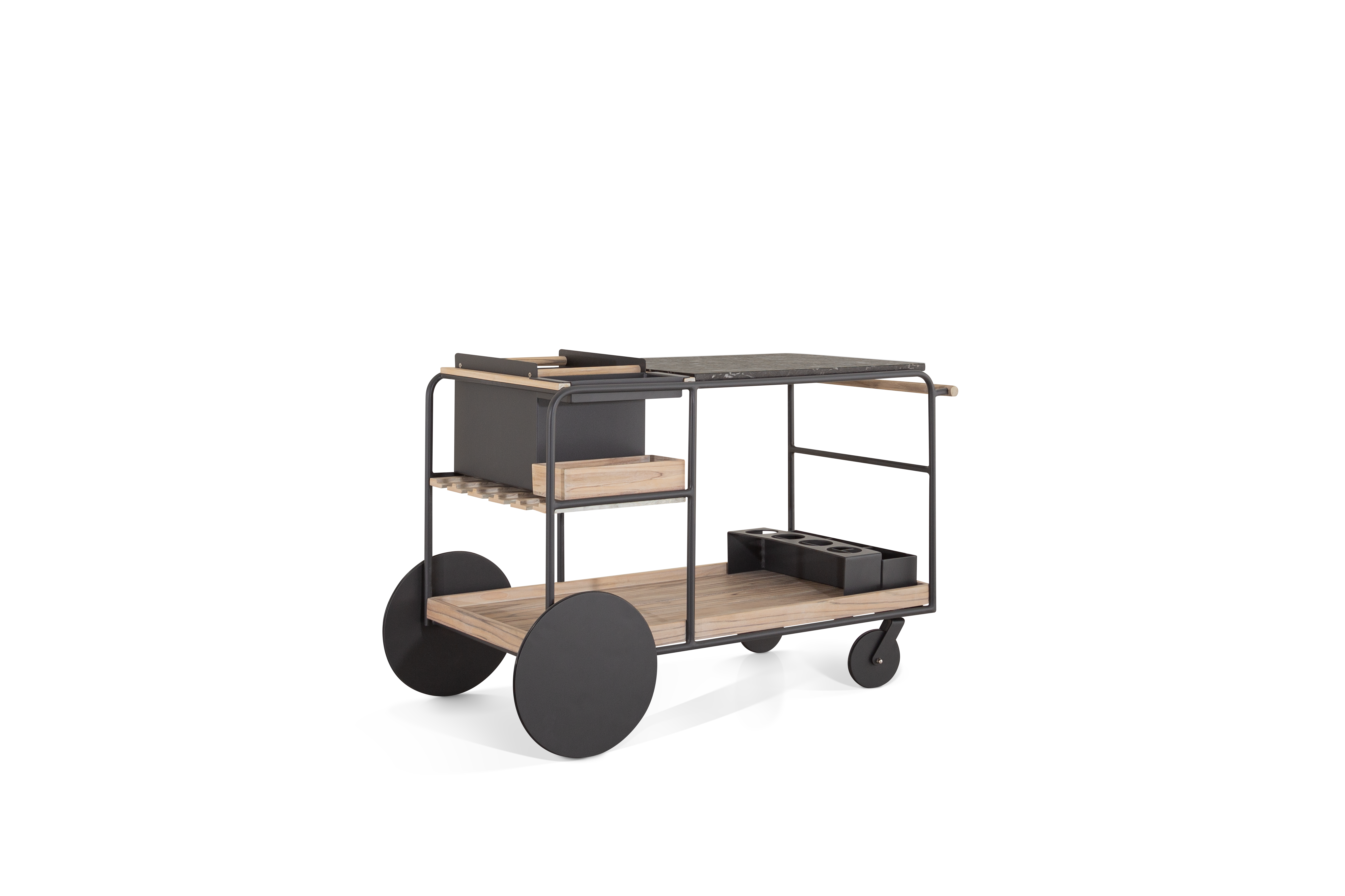 Para facilitar o entretenimento em áreas externas, a coleção conta ainda com o Carrinho Barman, projetado para armazenar bebidas e ter uma superfície sólida em pedra para servir.