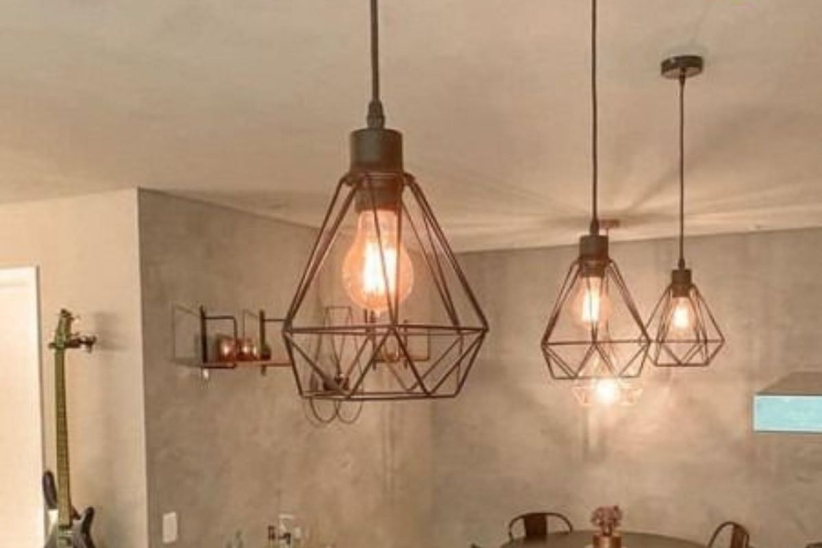 Para um visual mais industrial, a luminária de teto com corda e lâmpada vintage é ideal.