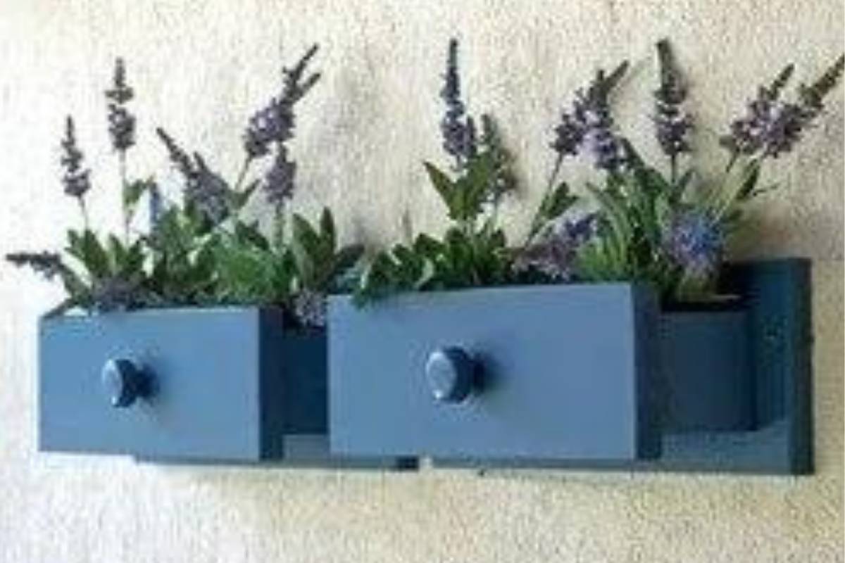 Gavetas são perfeitas para abrigar plantas. Seja fixando-as na parede, usando-as como prateleira ou simplesmente como caixa, sua pintura e puxadores adicionam charme ao verde das plantas.