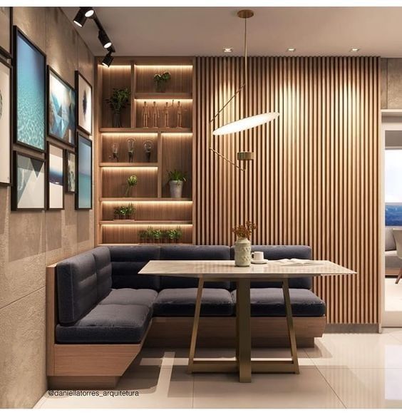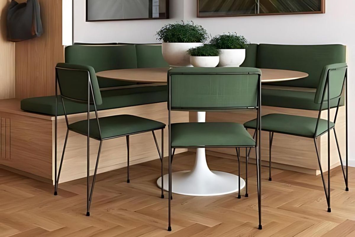 Esse tipo de assento nada mais é do que uma espécie de “sofá em L” que otimiza a área em que a mesa de jantar ou mesa de cozinha, fica posicionada, possibilitando que mais pessoas se sentem de forma confortável.