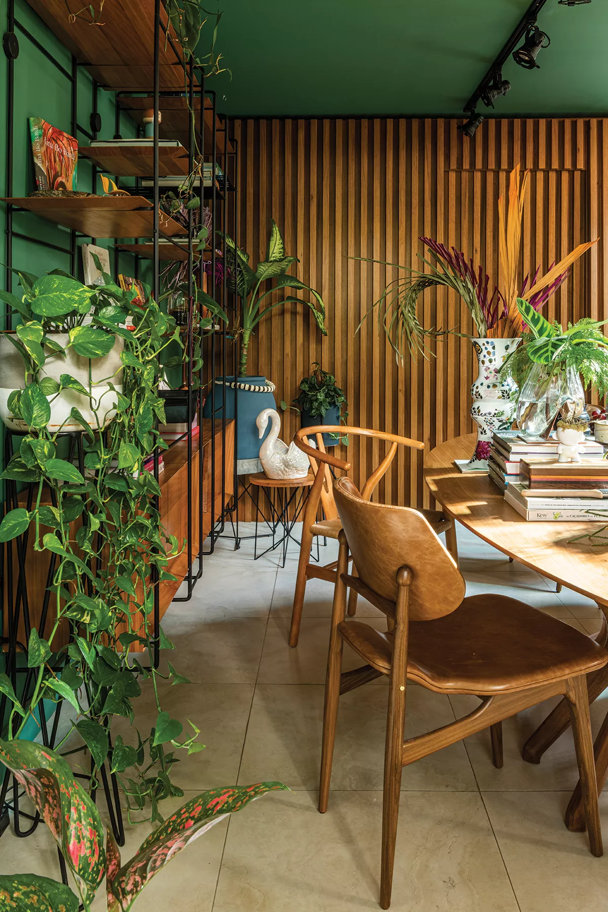 As plantas também combinam perfeitamente com tons terrosos, desde os claros até os escuros. Uma das formas de trabalhar essa combinação é colocar plantas sobre móveis de madeira natural.