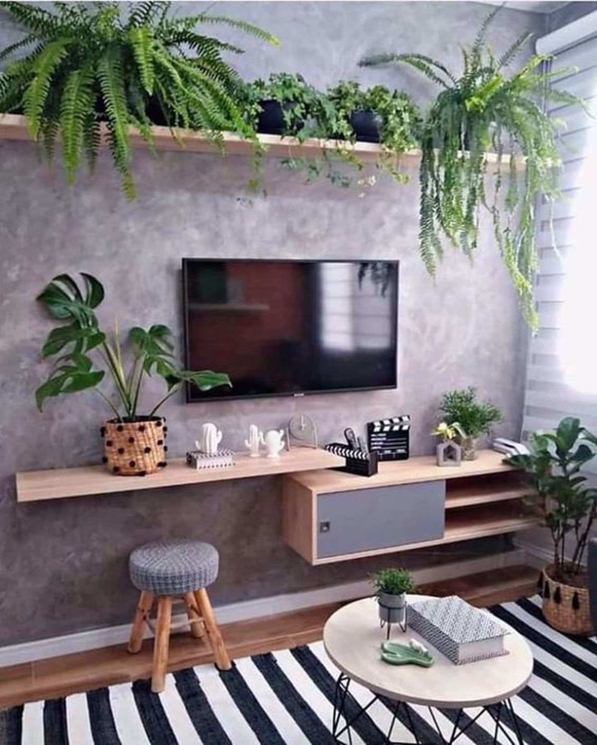 plantas em prateleira em sala com parede cinza
