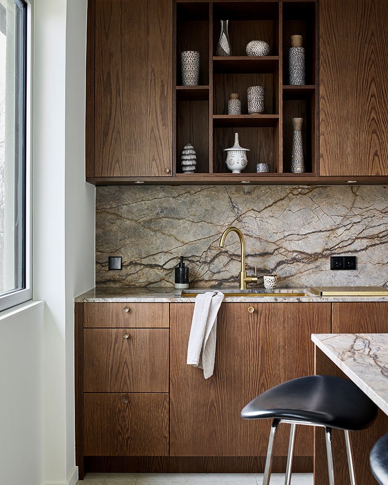 Uma dica é que você use tons de madeira mais claros se sua cozinha for pequena, associando-os com detalhes em tons neutros. Se é fã de uma madeira mais escura, tudo bem: aposte-a nos detalhes.