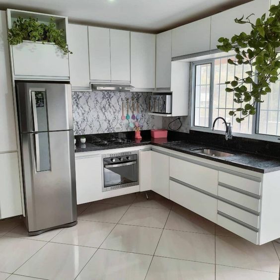 A cozinha em L com janela sobre a pia é indicada para uma variedade de espaços, desde apartamentos pequenos até casas maiores.