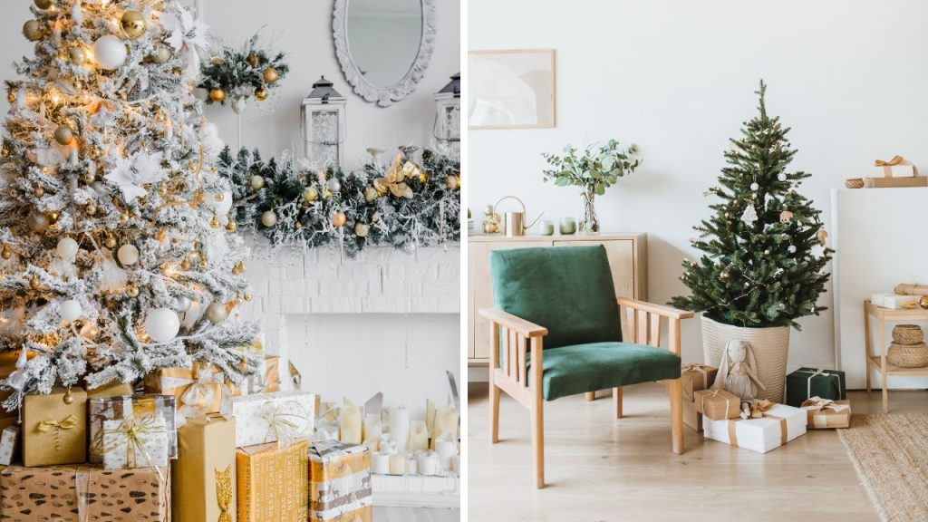 Árvores discretas, ornamentos monocromáticos e o uso de materiais naturais definem essa abordagem.