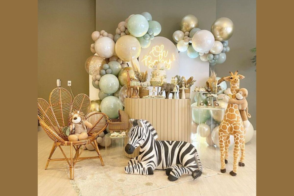 Para os amantes da natureza e da aventura, a terceira tendência de chá de bebê que promete fazer sucesso em 2024 é a decoração de Safári.
