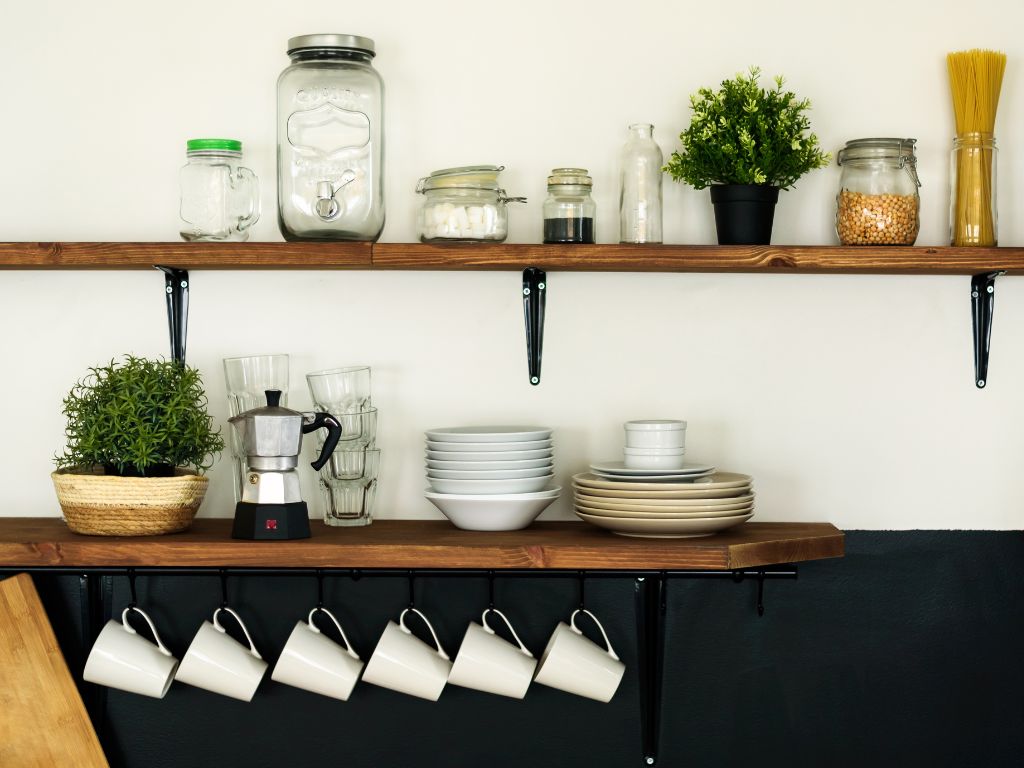 - Prateleiras flutuantes: Feitas de madeira ou MDF, são práticas para exibir louças bonitas, temperos ou objetos decorativos. Veja como usar prateleiras funcionais na sua cozinha que valorizem a decoração.