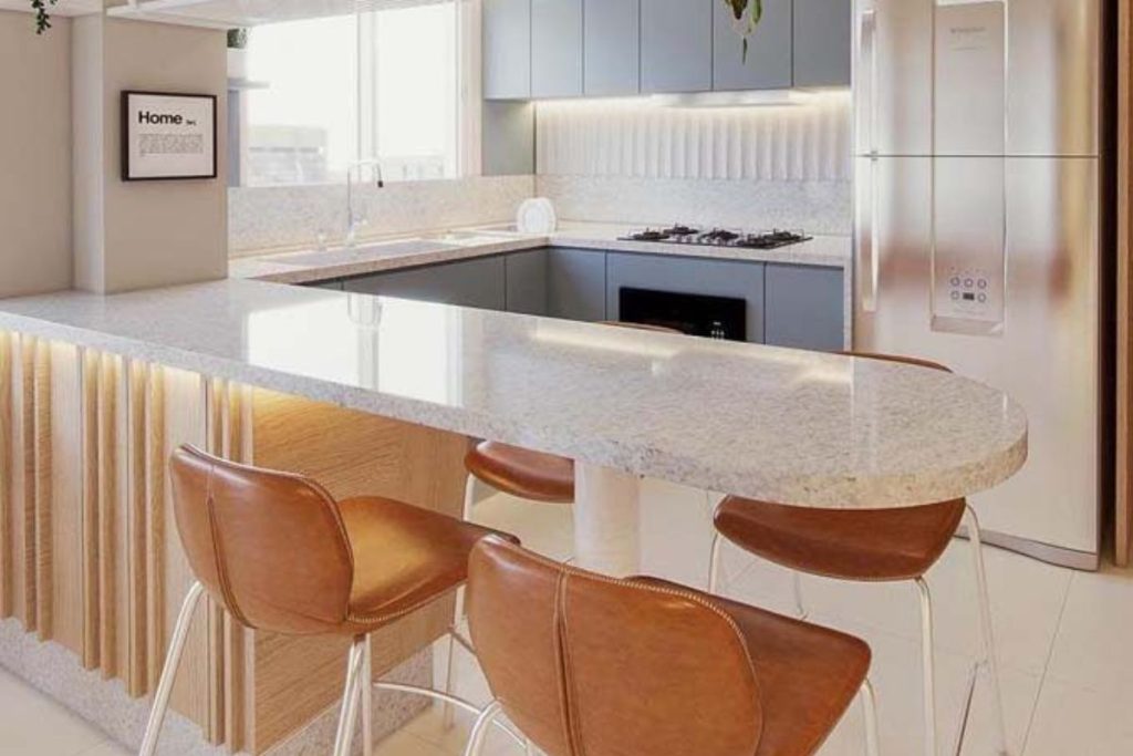 A cor clara do Branco Itaúnas ajuda a criar uma sensação de amplitude e luminosidade, essencial em cozinhas menores e a uniformidade da superfície do granito garante um espaço higiênico, perfeito para o manuseio de alimentos.