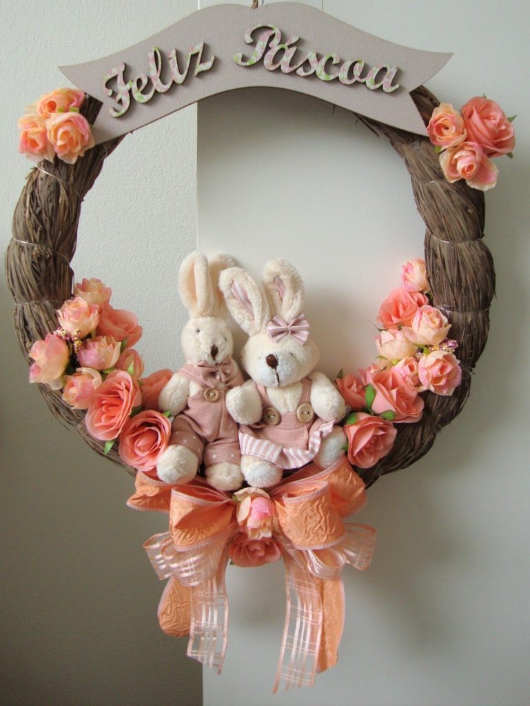 Os coelhinhos, que também são símbolos da Páscoa, deixarão sua guirlanda ainda mais encantadora! Você pode usar coelhos de plástico, tecido, feltro e pelúcia, desde que tenham tamanho proporcional ao da guirlanda.