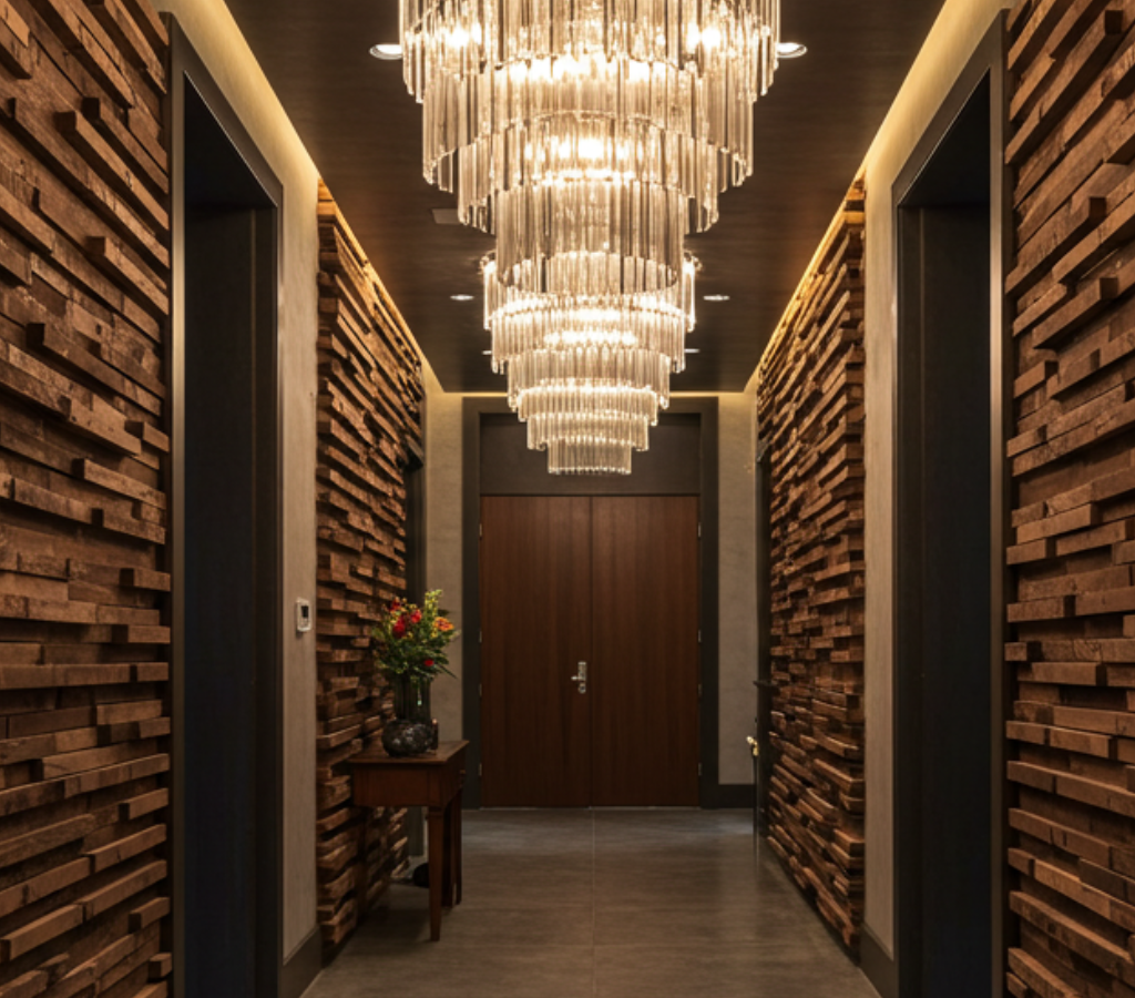 Caso o hall tenha uma área maior, um lustre ou uma luminária pendente pode ser um ponto focal interessante, desde que proporcional ao tamanho do ambiente.