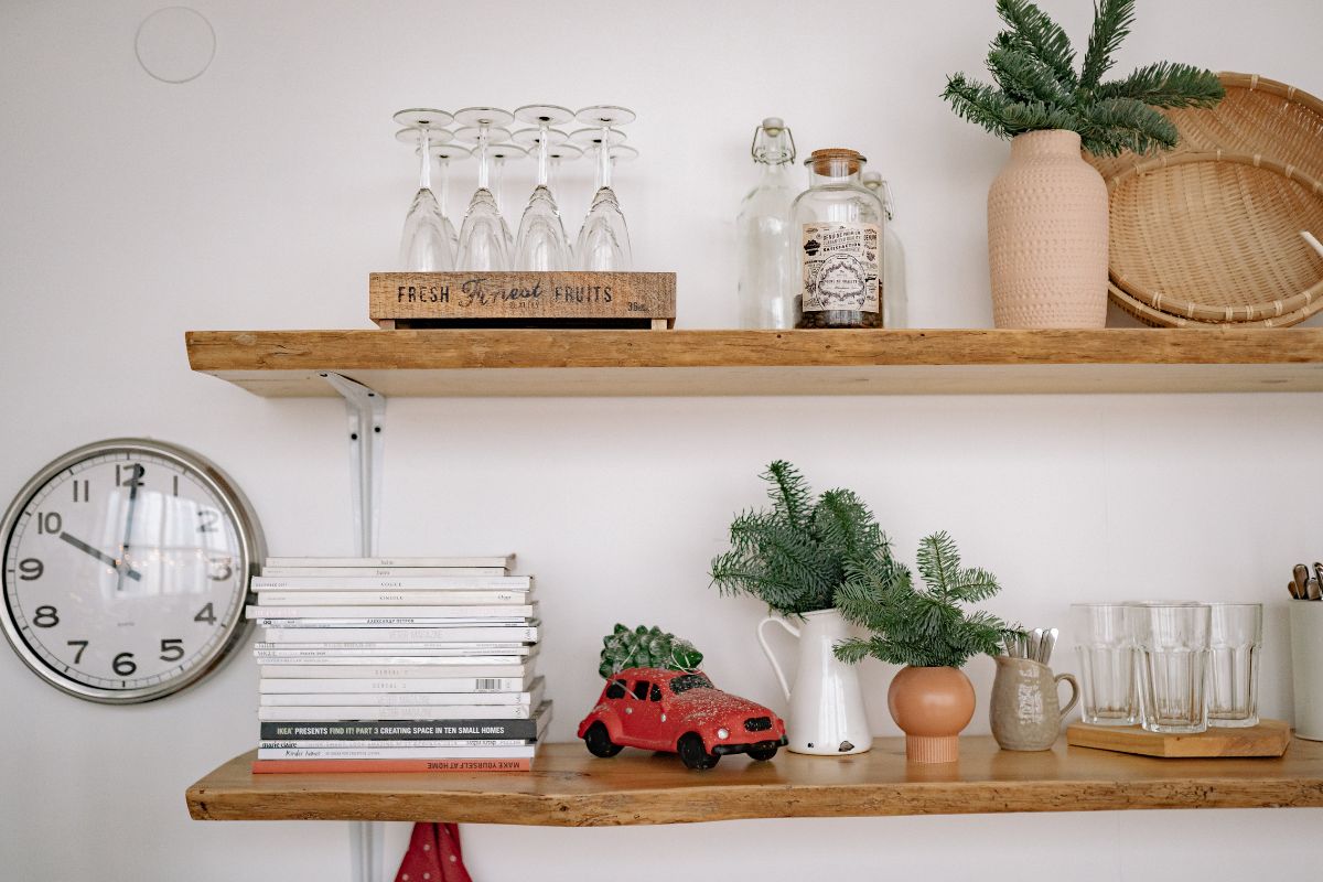 Prateleiras são itens funcionais, baratos e que podem ser bem decorados usando poucos itens. Elas permitem fácil acesso aos utensílios e mantêm o ambiente visualmente mais leve.