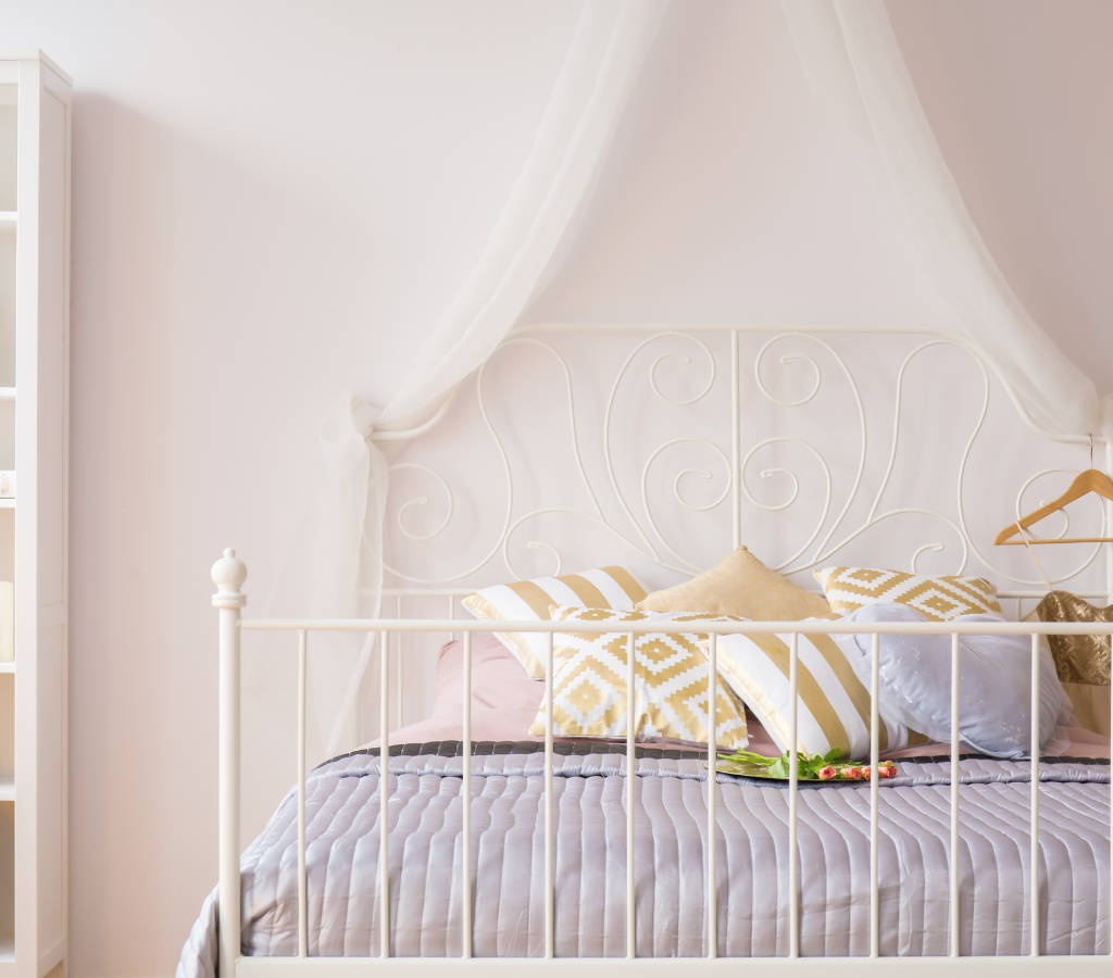 Um arco ou um retângulo em tons neutros, como bege ou cinza, pode ser suficiente para criar um efeito de cabeceira. Essa abordagem acaba ideal para quartos pequenos, pois não ocupa espaço físico, além de permitir alterações futuras com facilidade.