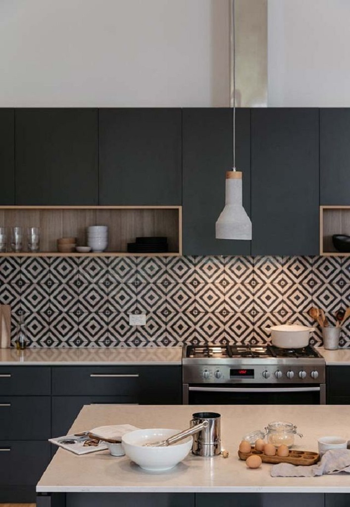 5. Azulejos com padrões gráficos em preto e branco para a cozinha