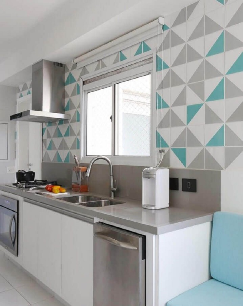 A combinação com móveis brancos reforça a leveza do ambiente, enquanto o padrão repetitivo adiciona charme ao espaço. É uma ótima escolha para cozinhas compactas que precisam de amplitude visual.
