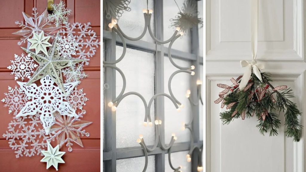Para decorar portas, adornos suspensos com formas típicas da época, como estrelas e flocos de neve, são uma excelente escolha.