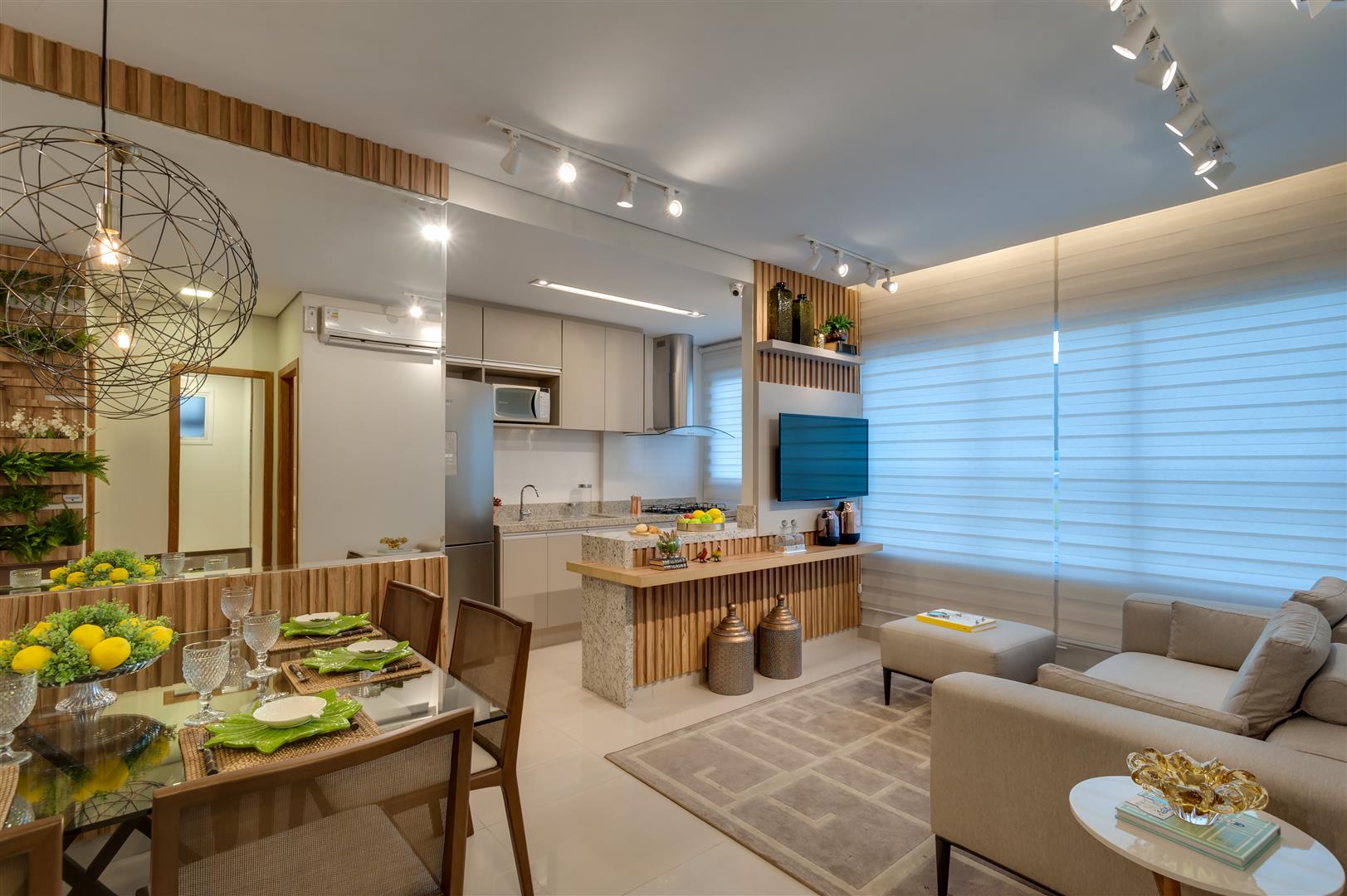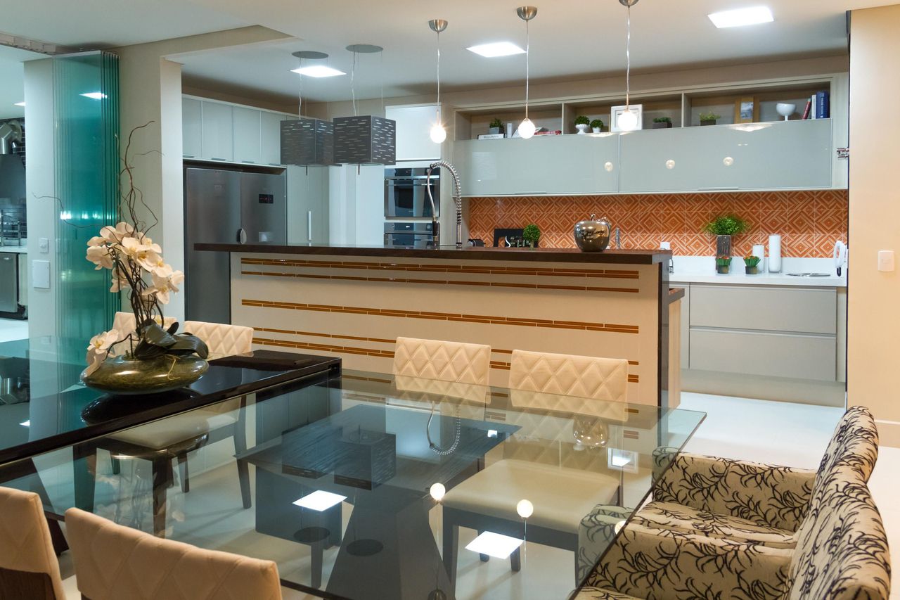Para definir como será a iluminação dos ambientes, é essencial pensar no uso que fará deles. Por exemplo, em uma sala de estar integrada com a cozinha, a luz branca deve ser predominante nessa última área, porque é um local que demanda mais luminosidade para cozinhar com facilidade.