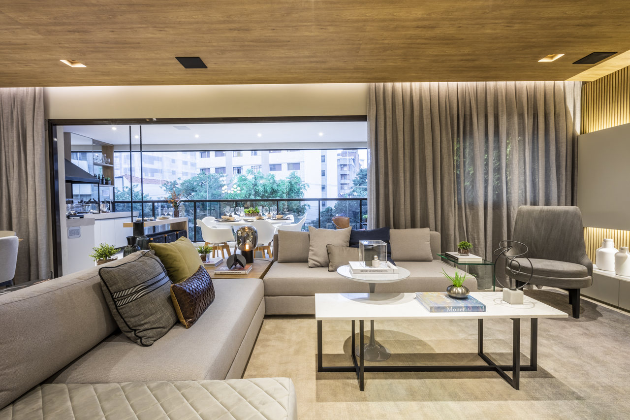 Uma sugestão que vale a pena para ambientes integrados são os plafons de sobrepor, que ajudam a criar uma luz homogênea e suave que se estende pelos ambientes diferentes.