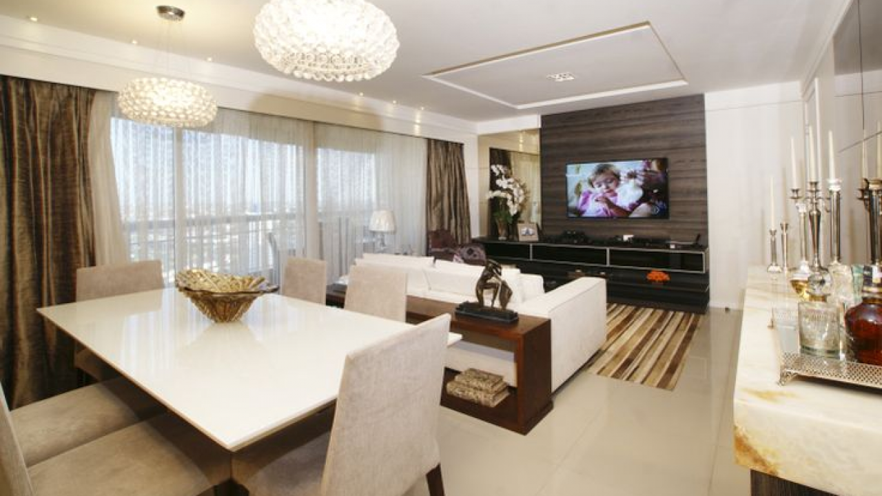 Já numa sala de estar integrada com a sala de jantar, a dica é apostar numa mescla de luz branca e amarelada. A branca ajudará a dar pontos de luz em locais que precisam ficar mais claros. Já a amarela tornará os espaços aconchegantes na medida certa para aproveitá-los ao máximo.