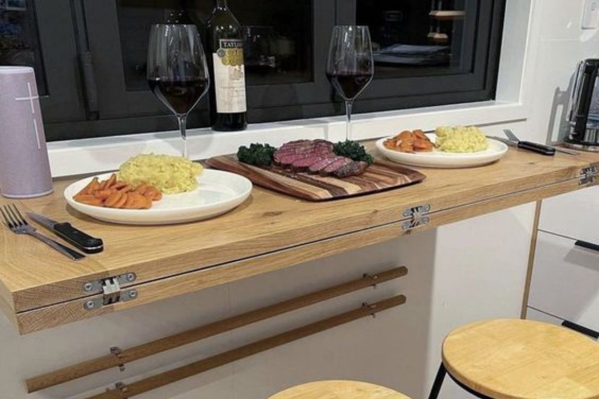 Se a configuração do espaço permitir, que tal embutir sua mesa dobrável como parte de outro móvel, como um armário ou uma ilha central da cozinha?
