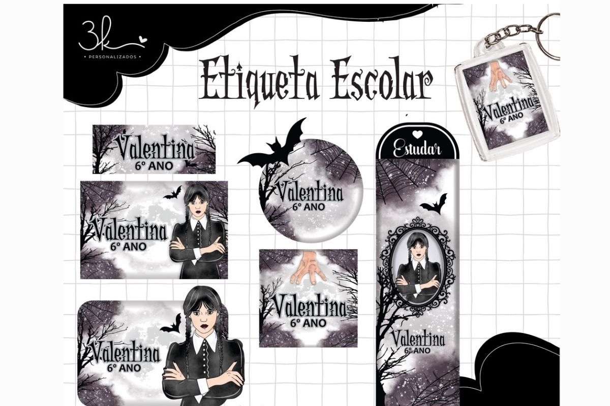 Por fim, nada melhor do que identificar todos os acessórios do material escolar dos filhos. E por que não fazer isso também utilizando o tema de Wandinha?