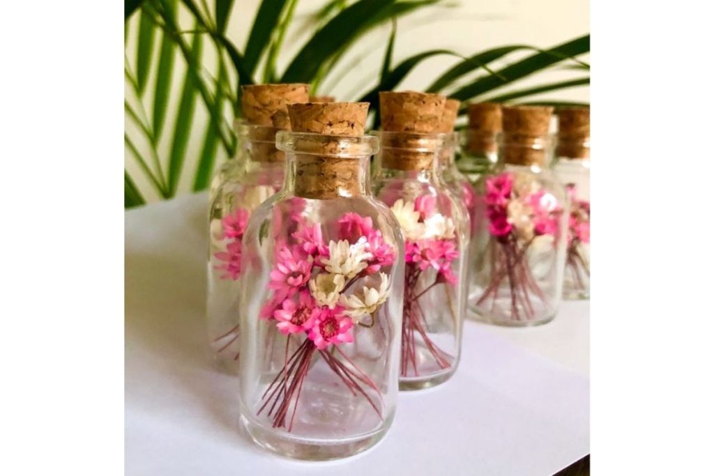 Vidros com flores desidratadas como lembrancinhas de aniversário