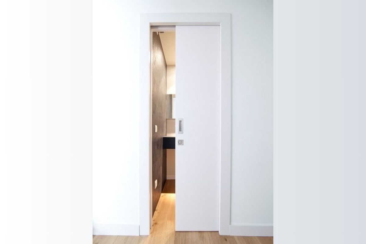 Deslizando suavemente para dentro da própria parede, seja de alvenaria ou drywall, esse modelo de porta de madeira aproveita melhor a área útil do cômodo e costuma ter uma estética discreta e moderna.