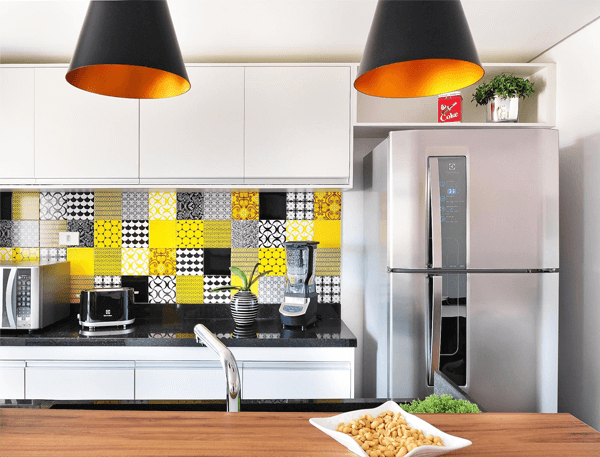 Com a bancada preta ou de outra cor neutra de sua preferência, você pode brincar com a decoração colocando adesivos que imitem pastilhas de cores e azulejos variados.