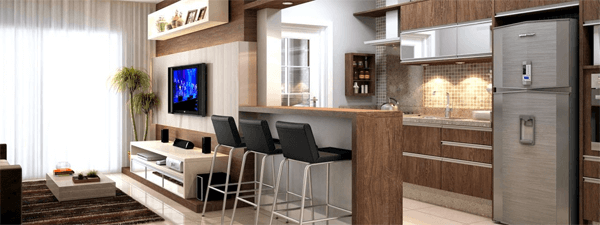 Invista em itens que podem dar a impressão de “aumentar” o ambiente, principalmente quando o assunto são cozinhas americanas com detalhes em exclusivo.