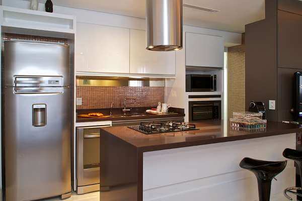 No exemplo de cozinha decorada abaixo, o cooktop na bancada mostra a importância dos móveis multifuncionais. Afinal, a bancada serve não somente para o fogão, como também como um lugar para fazer a refeição.