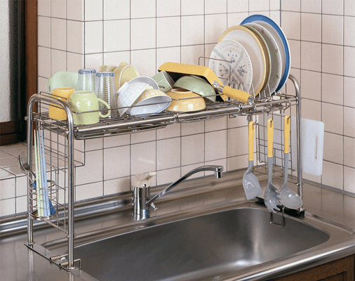 Nesse modelo mais simples o escorredor fica pendurado acima da pia e economiza muito espaço da bancada, fazendo com que caiba ainda mais louça.