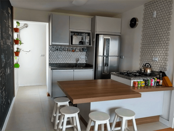 Isso sem falar que você pode investir na prateleira, seja para se livrar dos móveis de eletrodomésticos, além de incluir uma pequena mesa.