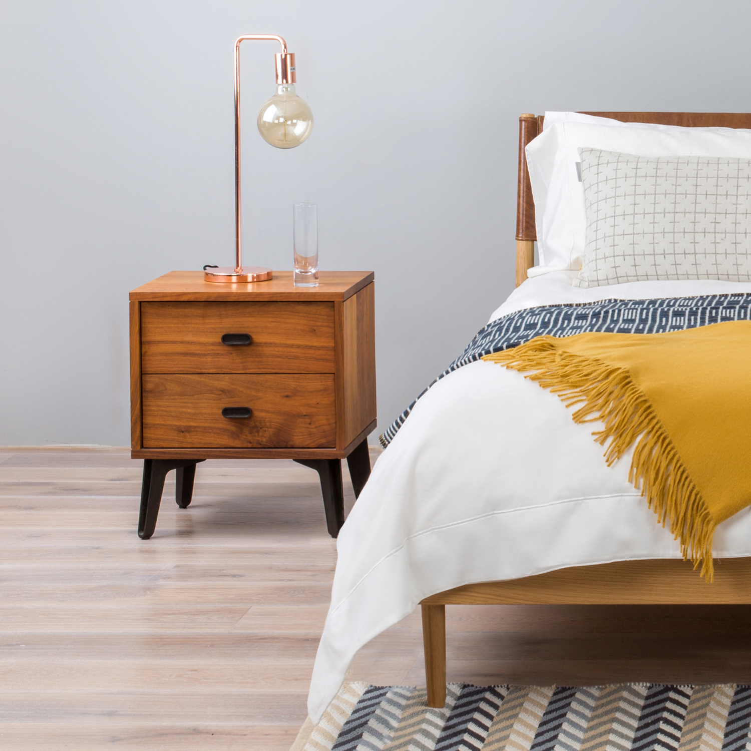 Ainda falando sobre mesas, a de cabeceira não é necessária e você pode deixá-la de lado, principalmente se estiver buscando mais espaço para usar uma cama maior, como uma queen ou king size.