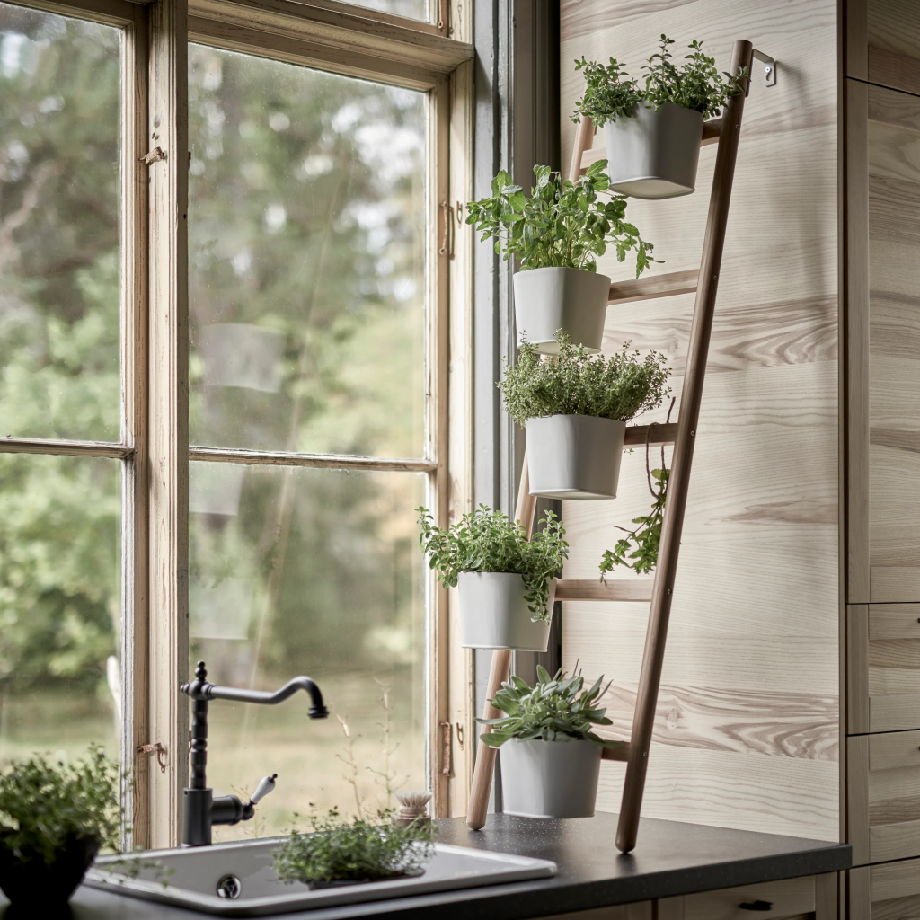 E que tal complementar seu jardim vertical com ervas, temperos e pequenos vegetais? Numa janela, mesmo em cozinhas pequenas, você pode criar sua mini horta.