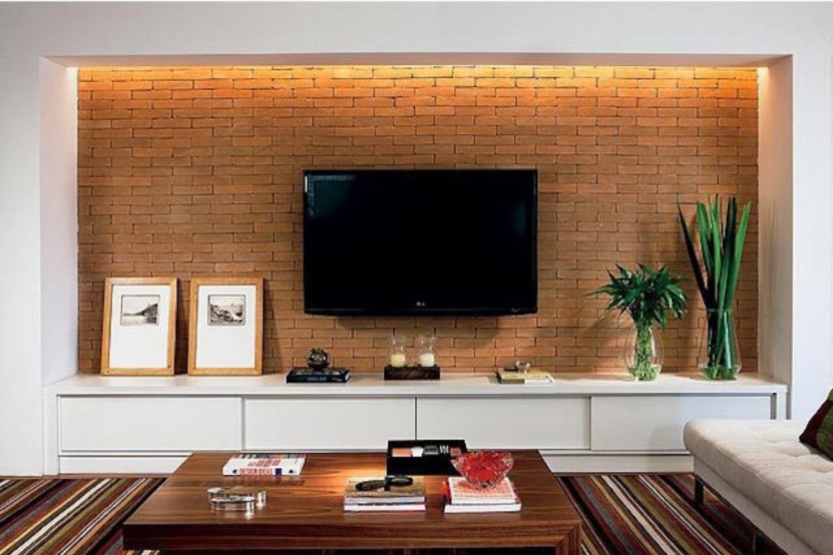 Essa tendência traz a sensação de um loft urbano para sua sala de estar. Os tijolos expostos adicionam textura e caráter ao ambiente, criando um contraste interessante com a tecnologia moderna da sua TV. É uma maneira única de equilibrar o antigo e o novo em sua decoração.